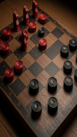 A moody, cinematic top-down flatlay capturing an unfinished game of checkers (drafts). The vertical