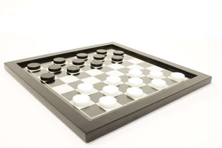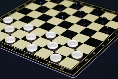 Checkers. Draught board. Direct conflict between white and brown pieces.