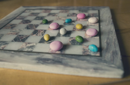 Sports or recreation Board game board with checkers. Hobby. Checkers on the playing field for the game.