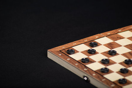 Checkerboard with checkers. Game concepts. Board game. Hobby. Checkers on the playing field for a game. On black background.