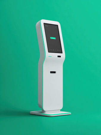 A modern self-service kiosk with a user-friendly design stands out against a vibrant green backdrop.