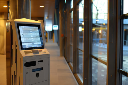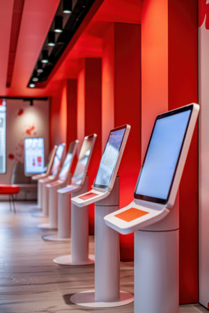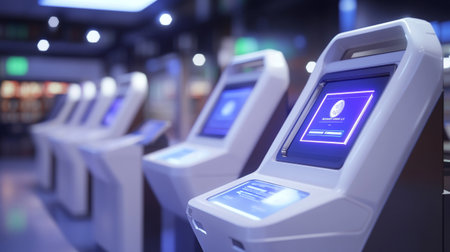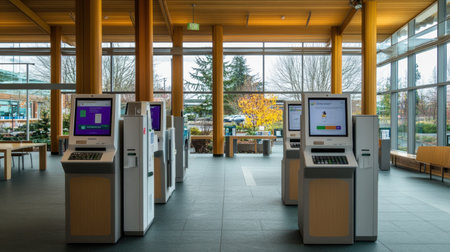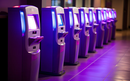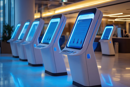 A series of modern self-service kiosks lined up in a bright, well-lit interior space, offering easy access to information and services for users.