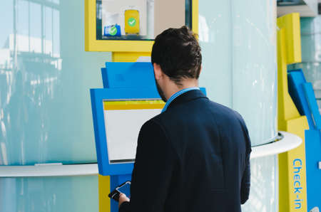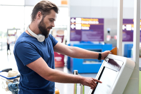 Young man is using a self service check in kiosk at the airport to avoid the queue