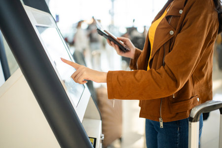 Woman passenger uses self service kiosk with touchscreen to check-in for flight to avoid long queue in contemporary airport terminal close side view