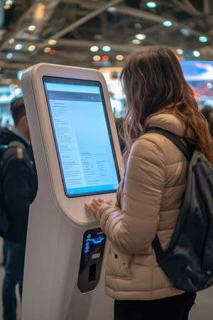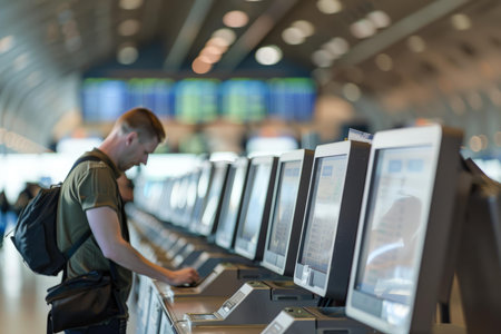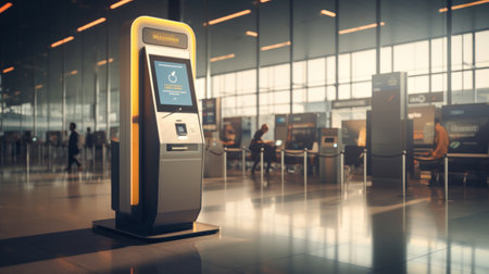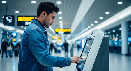 Traveler using self-service kiosk at airport technology indoor modern eye-level efficiency