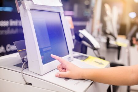 Female hand using the auto self service check-in for get the boarding pass at the airport.