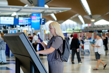 Woman using self-check-in kiosk at airport terminal while preparing for an upcoming flight in a busy travel environment