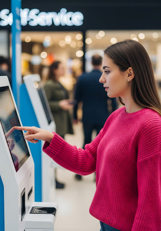 A young woman with long brown hair, wearing a bright pink knitted sweater, is shown in profile as she uses her index finger to interact with a touchscreen kiosk. The kiosk is white with blue accents and has a slot for payment or tickets. In the background, blurred figures of other people and a sign that reads Self Service are visible, suggesting a public indoor setting like a store or terminal. The lighting is bright and the overall mood is one of modern convenience.