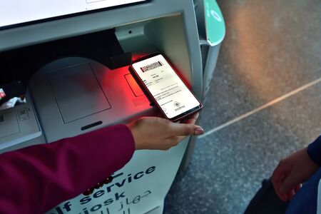 Traveler using a self check-in machine kiosk service at airport, Technology and smart application to confirm flight booking details, Travel concept.
