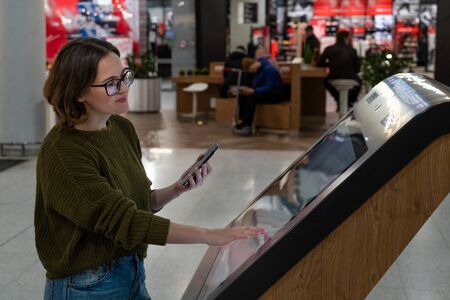 Casual caucasian woman using smart phone application and check-in machine at the airport getting the boarding pass. Modern technology on airport.