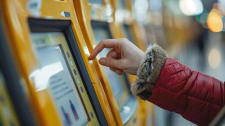 A close-up hand image, A female passenger is checking in for her flight at an airport self-check-in kiosk in the airport terminal, a finger touching on the screen. traveling, vacation, lifestyles