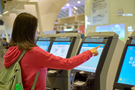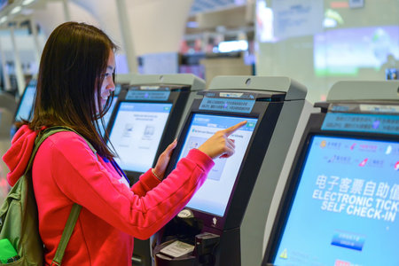 SHENZHEN, CHINA - FEBRUARY 16, 2015: woman use self check-in kiosk at Shenzhen Bao'an International Airport.