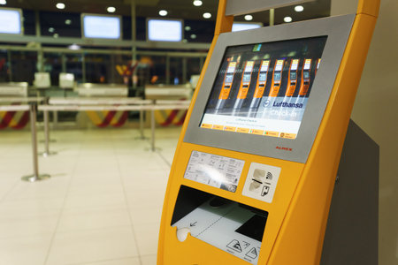 COLOGNE, GERMANY - SEP 18: Lufthansa check-in kiosk on September 18, 2014. Lufthansa is the flag carrier of Germany and also the largest airline in Europe, both in terms of overall passengers carried and fleet size when combined with its subsidiaries