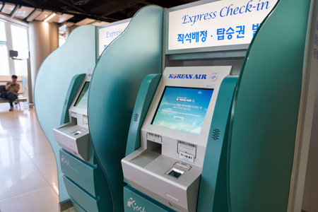 SEOUL, SOUTH KOREA - CIRCA MAY, 2017: self-service check-in kiosks at Gimpo Airport Domestic Terminal. Gimpo International Airport is located in the far western end of Seoul.
