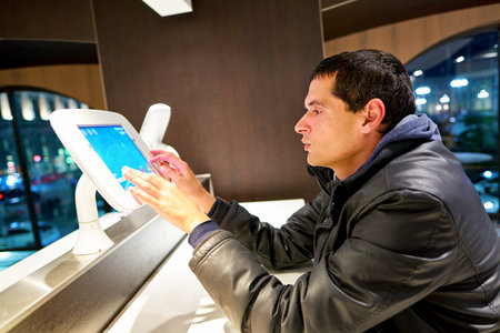 MOSCOW, RUSSIA - CIRCA OCTOBER, 2018: people use self-ordering kiosks at McDonald's restaurant.
