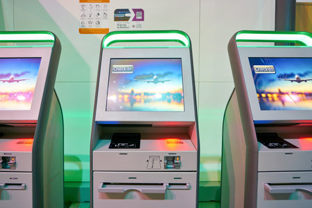 Automatic check-in machine in airport, boarding pass printer. Self-registration or registration online.