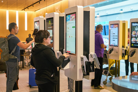 DUBAI, UAE - CIRCA JANUARY, 2019: people use self-ordering kiosks at McDonald's restaurant in Dubai International Airport.