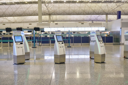 HONG KONG - CIRCA DECEMBER, 2019: self-service check-in kiosks at Hong Kong International Airport Terminal 1.
