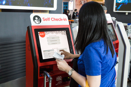 KUALA LUMPUR, MALAYSIA, JUNE 18, 2018: Passenger using convenient self check-in kiosk machine at KL International Airport facility to check in their flight.