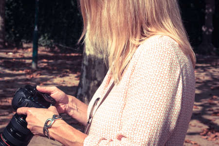 Photographer sitting and checking pictures in camera with back screen of camera when breaking