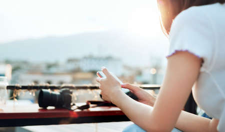 Side view of female hands holding smartphone on wooden home office desk with camera and supplies