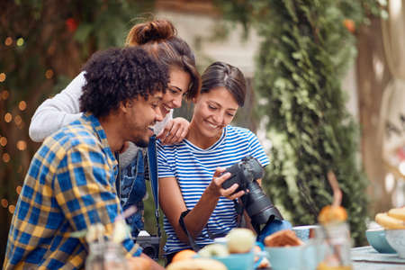 Friends enjoying camera photos at the bar's backyard. Quality friendship time together