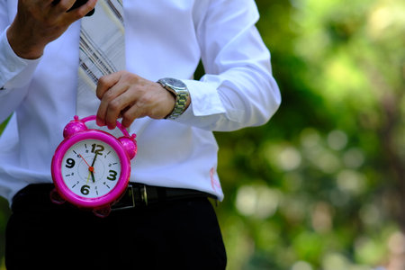 Time management, punctuality, awakening concept. Hand holding alarm clock on light background