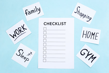 Checklist and many paper cards with hand drawing of different life activities, top view. Life balance and planning concept
