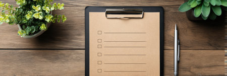 A modern clipboard holds an empty motivational goal list, placed on a wooden surface with small potted plants, creating a refreshing and inspiring workspace.