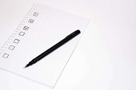 Check list. Square items are empty and checked with a tick. Squared notebook with black pen on a white background. Record ideas, notes, plans, tasks. Copy Space