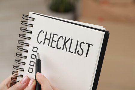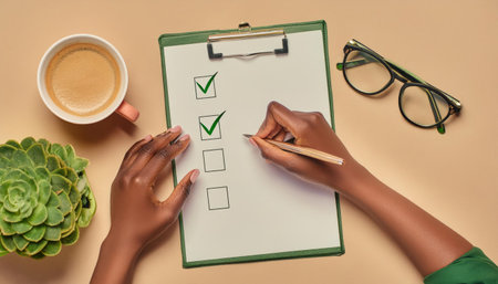 Close up of hands checking off completed tasks on a clipboard checklist, ensuring efficient workflow and project management
