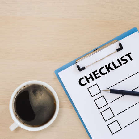 checklist box on clipboard with pen and coffee cup on wooden table. check choice answer test. checklist information writing.