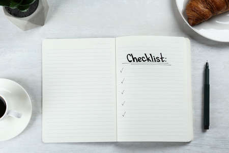 Notebook with inscription Checklist, cup of coffee and croissant on white wooden table, flat lay