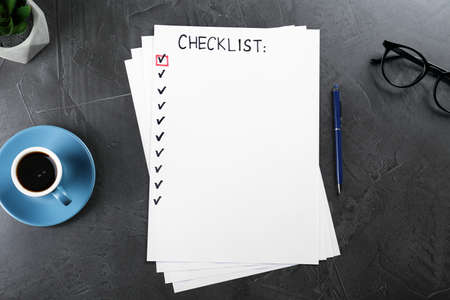 Paper sheet with inscription Checklist, cup of coffee and eyeglasses on dark gray table, flat lay