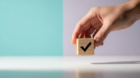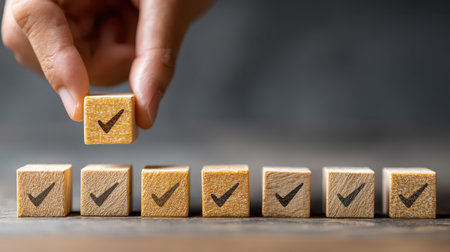 Close-Up Hand Placing Wooden Block with Check Mark Among Other Blocks on Table, Concept of Verification, Completion, Success, and Goal Achievement