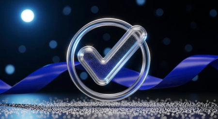 A clear glass checkmark icon within a circle, set against a dark background with sparkling particles and soft blue bokeh lights. A flowing blue ribbon adds a touch of elegance.