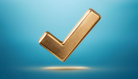 A shiny gold tick mark, often symbolizing confirmation or correct choice floating or flying isolated on light blue background