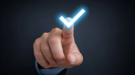 A hand with a finger poised to touch a glowing checkmark icon, representing confirmation, success, and positive decision-making in digital environments.