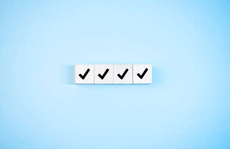 Checklist and check mark concept. Check mark on wooden blocks on light blue background