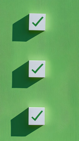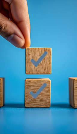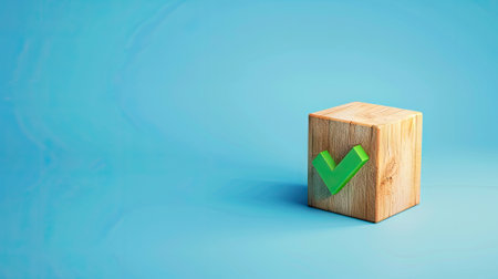 Wooden blocks with checkmark symbols on a light blue background representing success, approval, validation, and positive outcomes in various contexts
