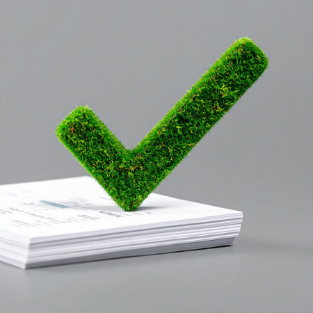 A vibrant green, grass-covered checkmark stands proudly on a stack of official documents, symbolizing the successful completion of an environmental audit.