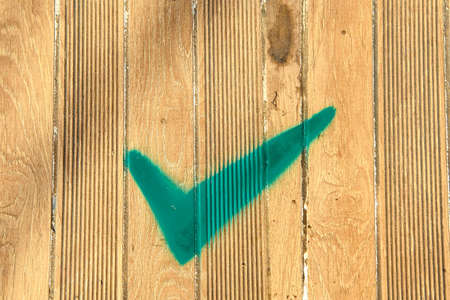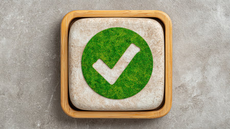 A green check mark icon is centrally positioned within a square frame. The icon sits atop a textured, light-colored surface within a wooden border. The image displays a flat overhead perspective with detailed texture and shadow effects, suitable for a range of design projects.