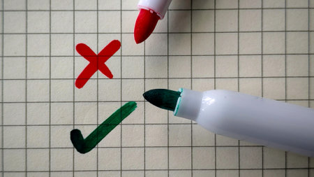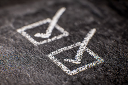 Check boxes with a red tick written with chalk on a smudged blackboard