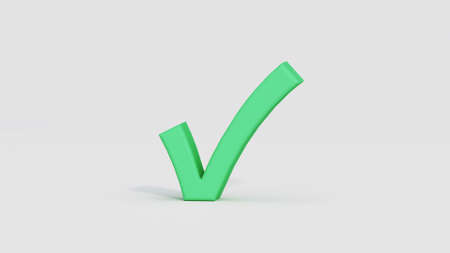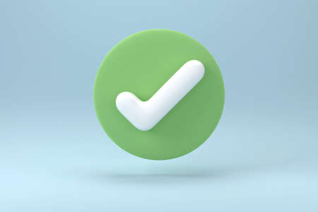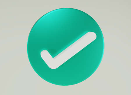 Green button with check mark, 3d rendering. Computer digital drawing.