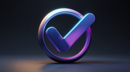 A glowing neon check mark icon sits atop a dark surface, symbolizing approval and agreement. The image showcases a futuristic style with blue highlights and sharp contrasts. Its design suggests technological themes, suitable for various applications.