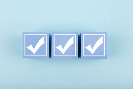 Three checkmarks on multicolored cubes in a row in the middle of bright pastel blue background. Concept of questionary, checklist, to do list, planning, business or verification. Modern minimal composition