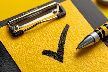 Close-up of a clipboard with a textured yellow sheet featuring a bold black checkmark, accompanied by a pen. symbolizes task completion, organization, and productivity in office or personal settings. Generative AI