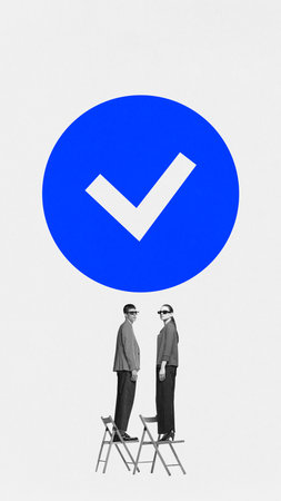 Modern aesthetic artwork. Two people on directors chairs facing each other under large check mark on blue circle against white background. Concept of multimedia, digital reality, tasks. Ad