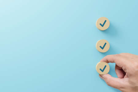 Hand putting correct sign which print screen on wooden cube block for approve project and ISO document concept.