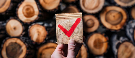 Hand holding red check mark on a stack of wood representing completion of a checklist. Concept Achievement, Checklist Completed, Success Symbol, Wood Background, Hand Holding Check Mark